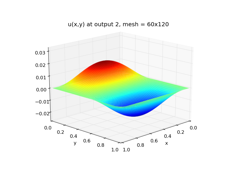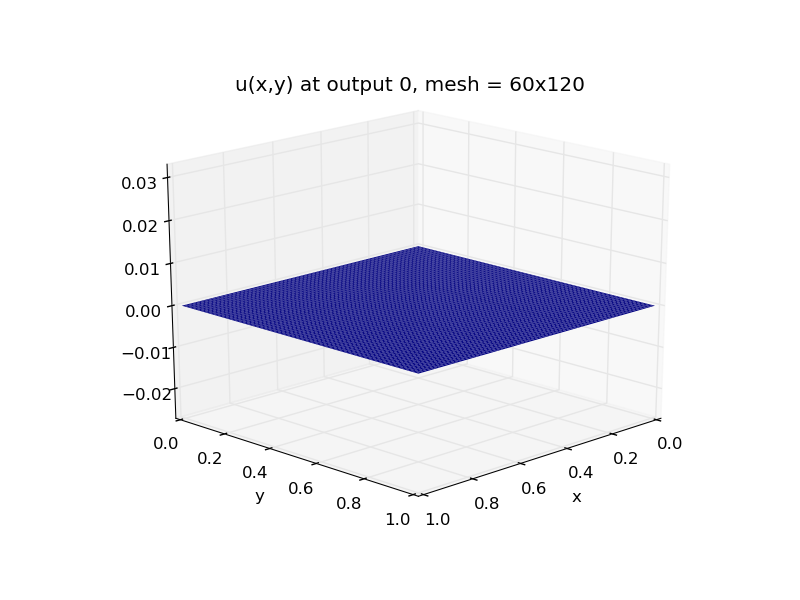 for \(t \in [0, 0.3]\), and \((x,y) \in [0, 1]^2\), with initial condition \(u(0,x,y) = 0\), stationary boundary conditions,