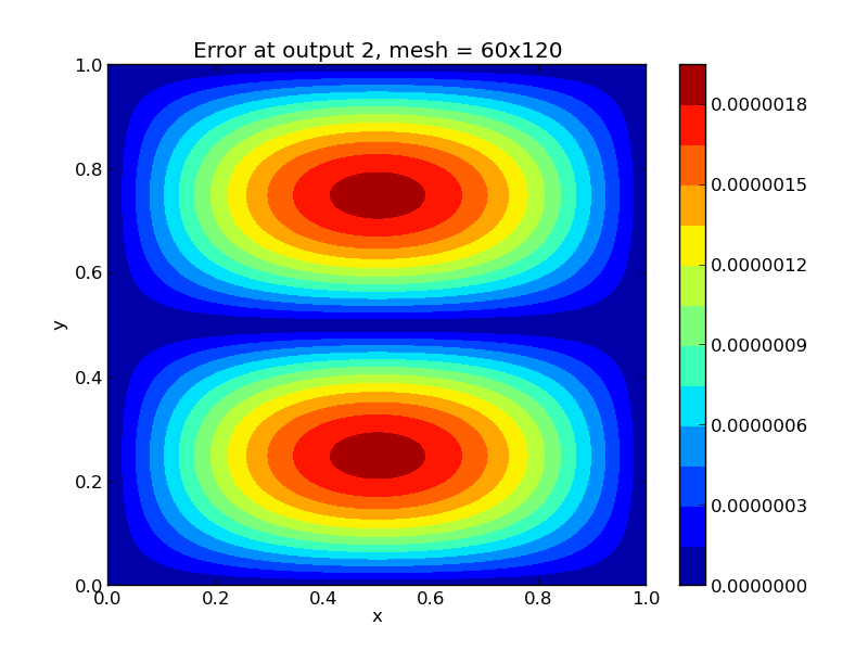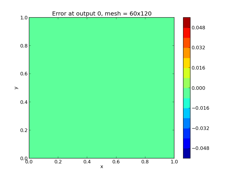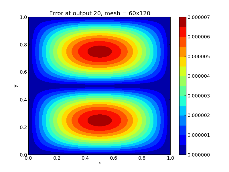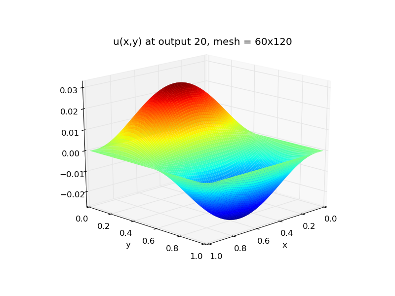 The problem is set up to use spatial grid parameters \(nx=60\) and \(ny=120\), with heat conductivity parameters \(k_x=0.5\) and \(k_y=0.75\). The problem is run using scalar relative and absolute solver tolerances of \(rtol=10^{-5}\) and \(atol=10^{-10}\).